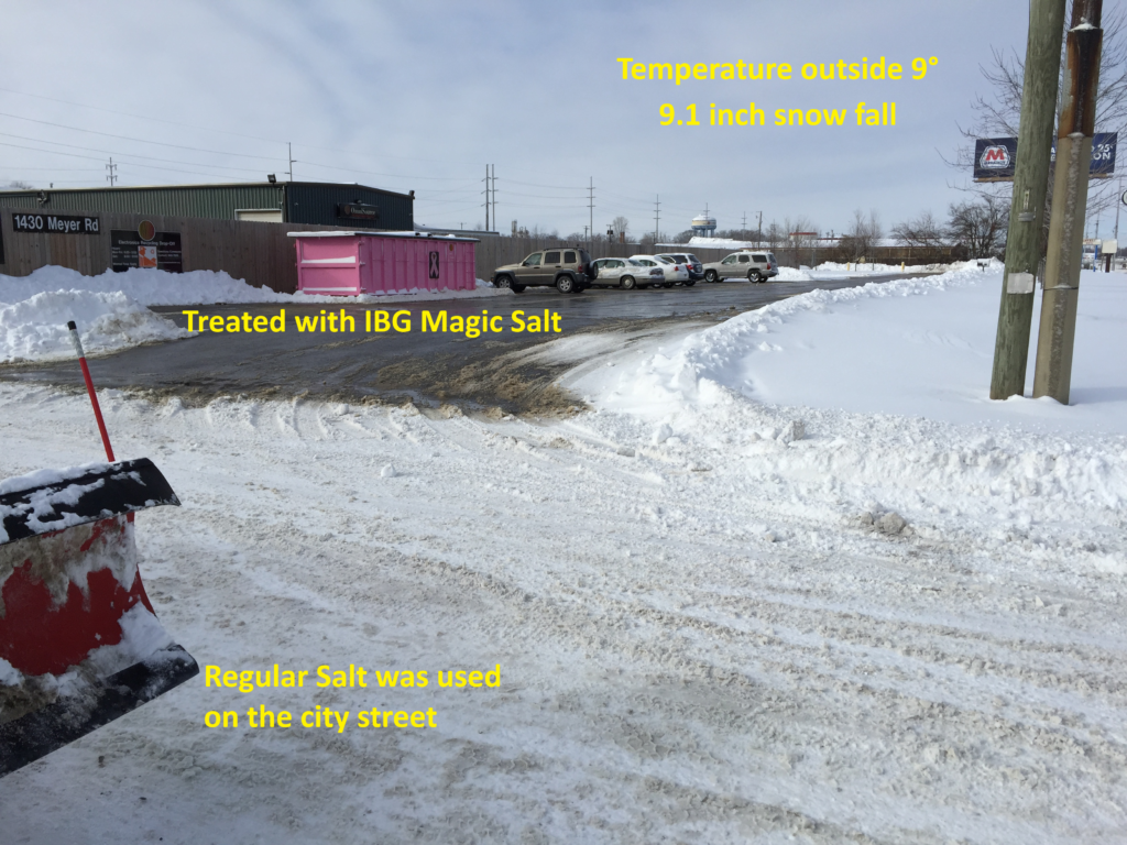Contractor uses Ice B’Gone and did not have to spread any material for De-Icing. The contractor had spread Ice B’Gone four days prior to a storm. The residual Magic Salt, now on the pavement, reacted with the “dusting of snow”, which melted on contact. The end result — the contractor did his job by providing a safe environment. The possibility of a slip and fall was greatly reduced and the contractor did not even show up. The contractor saved labor, time, and material, and has no sand to clean up in the spring.